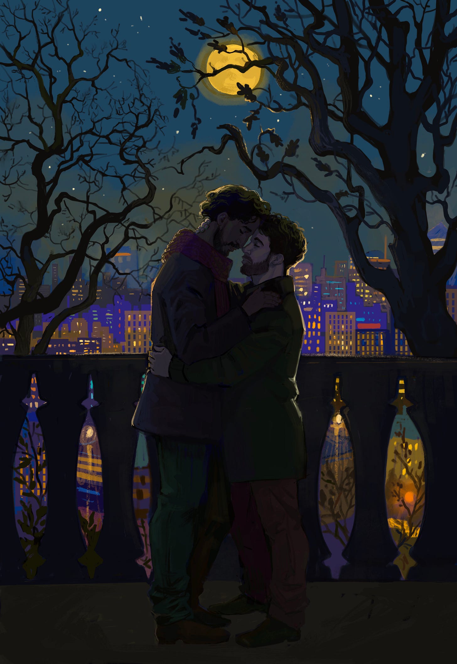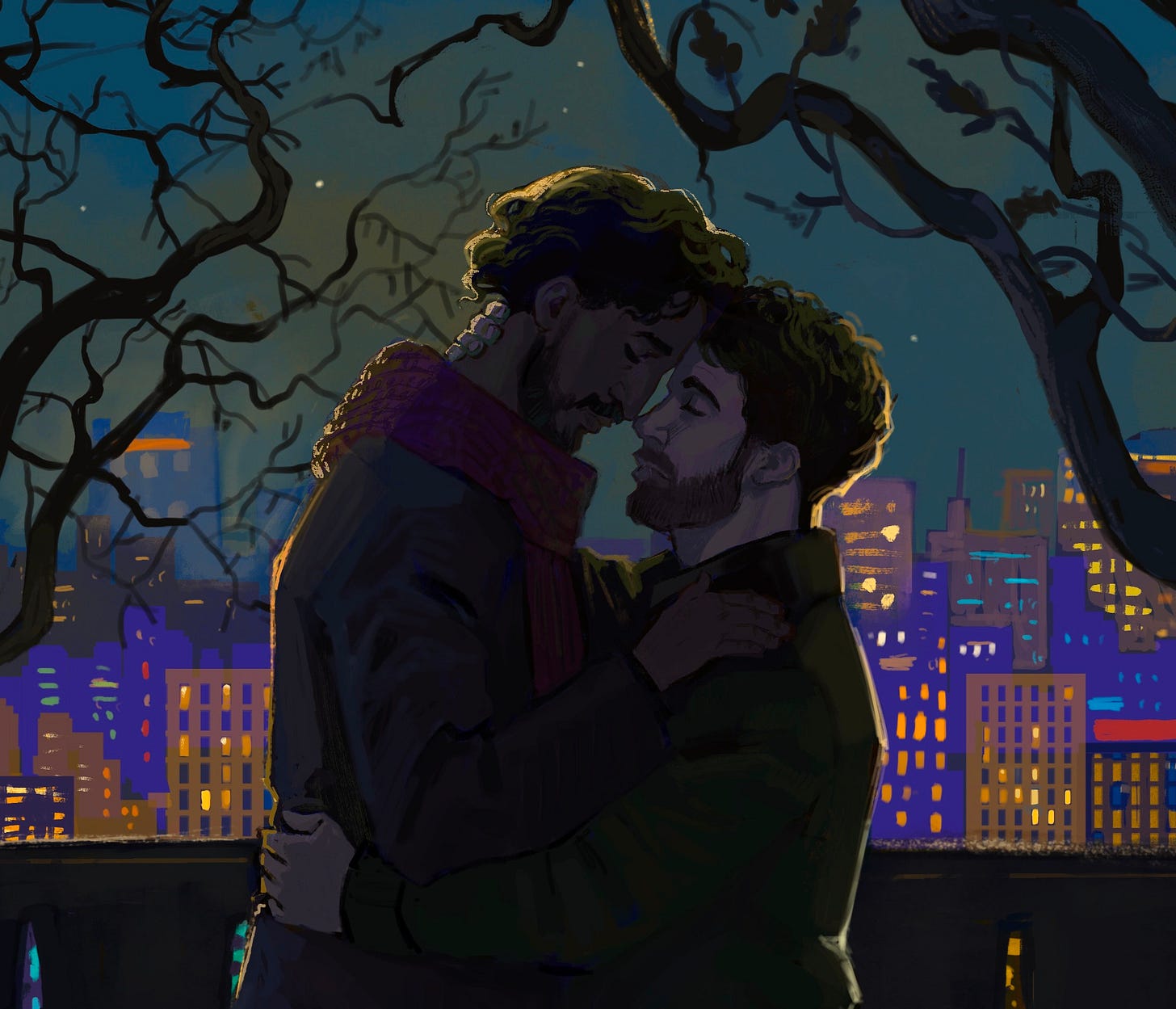 First, please appreciate some wonderful art of Matt and Aiden by Roz (I almost never commission things but I’m so happy I did this). I just love everything about this, from the soft moon lighting, to the blue of the night sky and skyline, to Matt’s hand on Aiden’s waist, to the height difference, to the yearning.