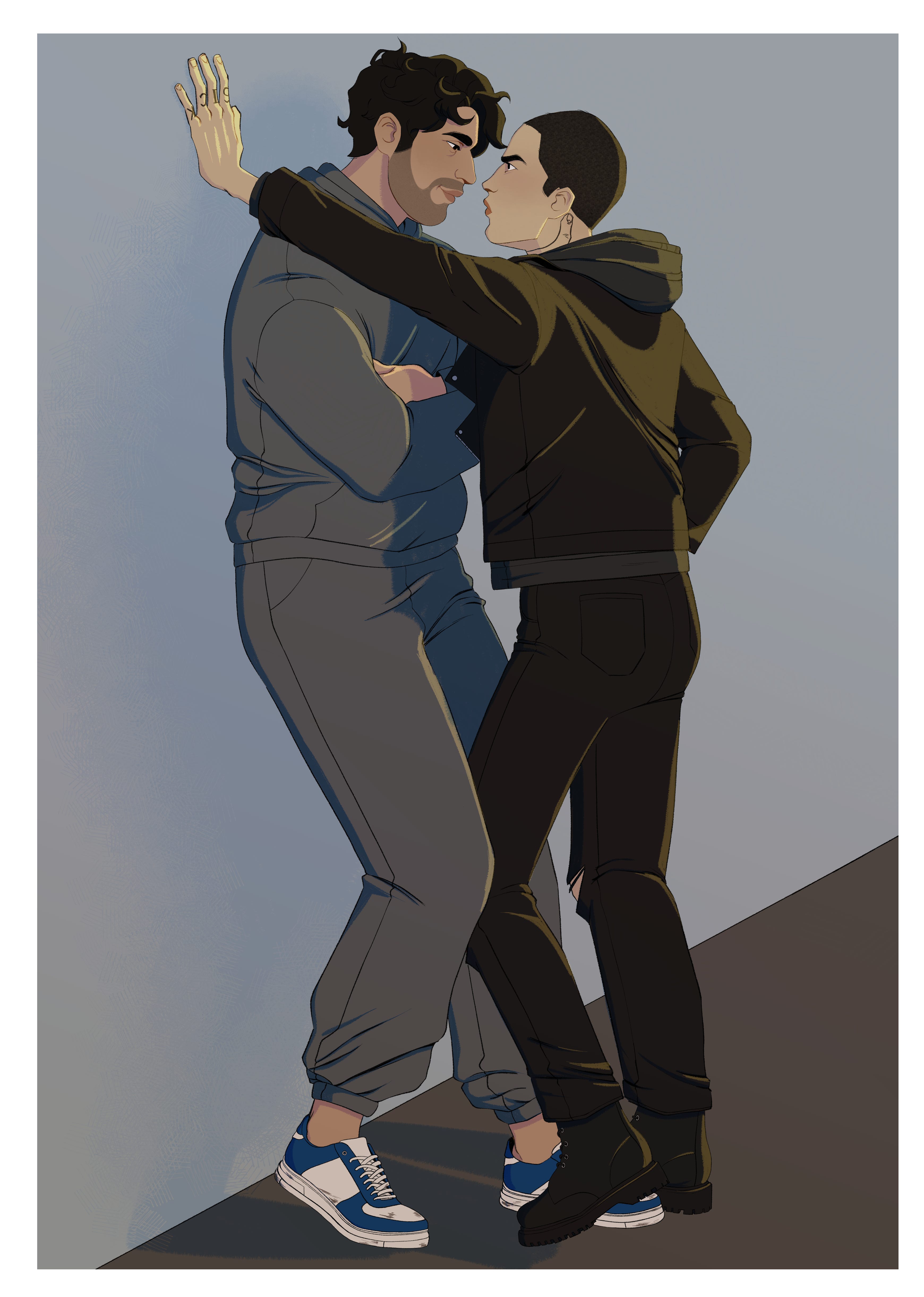 I commissioned some art of Mike and Danny from the amazing queerente and I am posting it everywhere but I wanted to share it with you here, too, because I’m honestly just so happy with everything about it. Mike’s angry face and silly little throat tattoo; Danny’s patience and size: